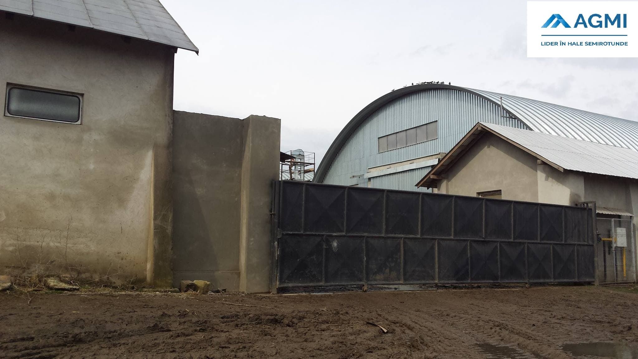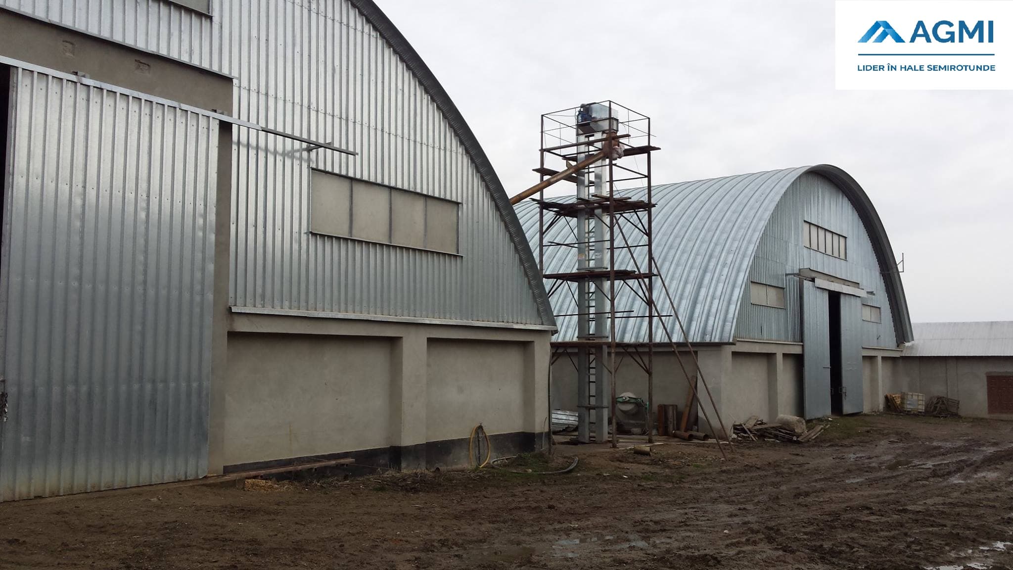 Hale semirotunde pentru cereale în comuna Mircești, județul Iași. Dimensiuni de 2 x 1250 mp, cu uscător la mijloc.